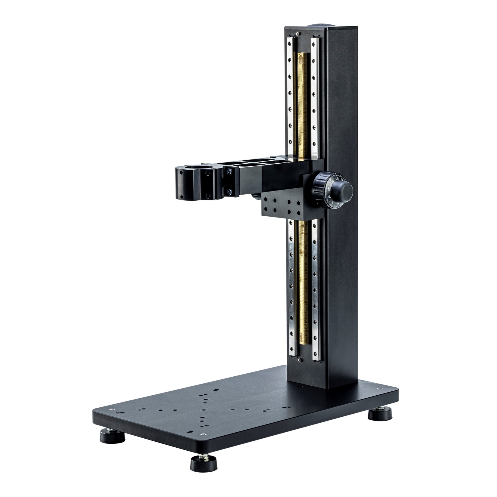 The solid CV-ST-P stand has a Z-axis with two precision guides and a brass gear rack. The combined quick adjustment and fine adjustment can be operated on both sides. The boom and optics holder are made of solid aluminum. The opening in the optics holder is designed for manual and motorized kito zoom. The extremely fine height adjustment makes the tripod very suitable for focus stacking. The height of the feet can be adjusted individually. The base plates are available with or without holes and internal thread. The base plates are available with or without holes and internal thread. A third version has a high-quality, dimmable LED underlight plate that is embedded in the base plate.