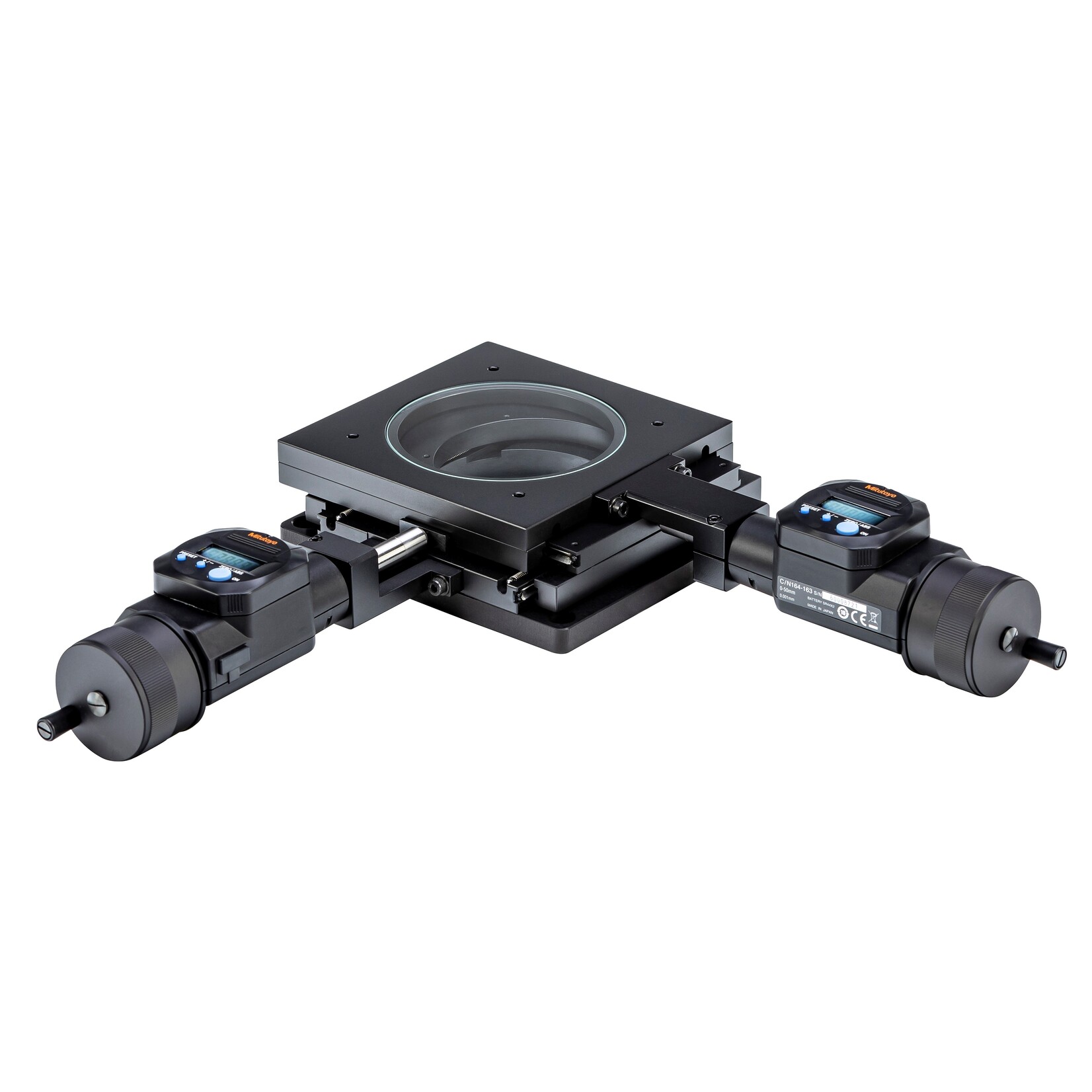 Table de mesure transversale MTU-50-MIT avec plage de mesure 50x50 mm. La table transversale peut être livrée avec une fixation 18 mm pour les touches mobiles numériques (Mitutoyo) graduation 0,001 mm jointes